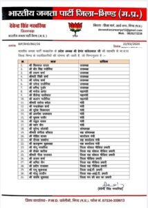 वहीं, भिंड और छतरपुर जिलों में भी जिला कार्यकारिणी का ऐलान कर दिया गया है। घोषित पदाधिकारियों को संगठन विस्तार, सदस्यता अभियान और आगामी कार्यक्रमों की जिम्मेदारी सौंपी गई है। पार्टी कार्यकर्ताओं में नई नियुक्तियों को लेकर उत्साह का माहौल है।