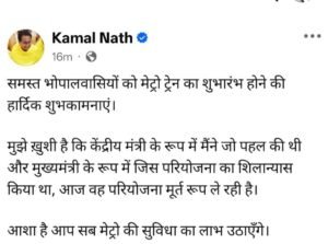 कमलनाथ ने सोशल मीडिया प्लेटफॉर्म ‘एक्स’ पर पोस्ट करते हुए लिखा कि समस्त भोपालवासियों को मेट्रो ट्रेन के शुभारंभ की हार्दिक शुभकामनाएं। उन्होंने कहा कि केंद्रीय मंत्री के रूप में उन्होंने इस परियोजना की पहल की थी और मुख्यमंत्री रहते हुए भोपाल मेट्रो का शिलान्यास भी उन्होंने ही किया था। आज यह देखकर खुशी हो रही है कि वह परियोजना मूर्त रूप ले रही है।