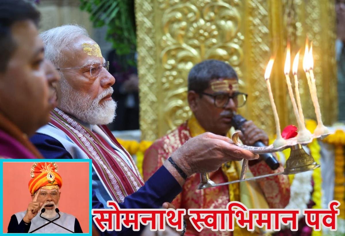 प्रधानमंत्री नरेंद्र मोदी तीन दिवसीय गुजरात दौरे पर हैं और इसी क्रम में उन्होंने सोमनाथ स्वाभिमान पर्व (Somnath Swabhiman Parv) के अवसर पर सोमनाथ मंदिर में पूजा-अर्चना की। दौरे के दूसरे दिन पीएम मोदी शौर्य यात्रा में शामिल हुए और इसके बाद मंदिर पहुंचे, जहां उन्होंने श्रद्धालुओं और उपस्थित जनसभा को संबोधित किया।